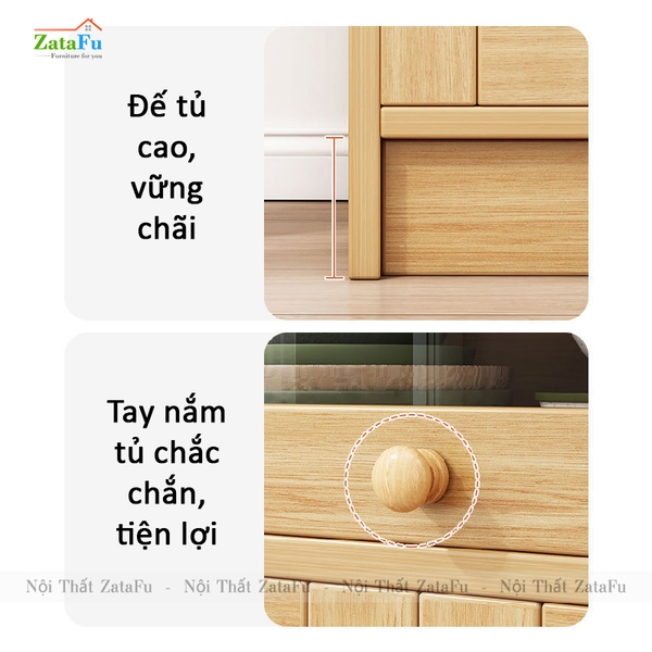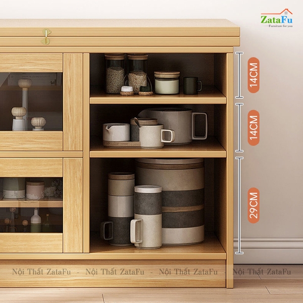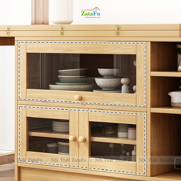 Tủ chứa đồ được thiết kế kết hợp với bàn nhằm mang lại chỗ chứa và sự thuận tiện cần có. Với các ngăn hộc, chúng ta tận dụng để xếp và bảo quản các món đồ dùng phòng bếp luôn cần sử dụng trong bữa ăn như chén đĩa, bát đũa,... nhằm hạn chế đi lại.