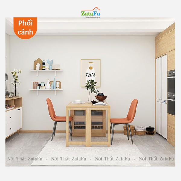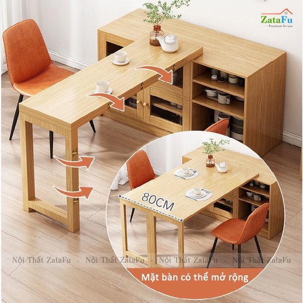 Bàn ăn được kết hợp vào tủ đựng đồ, dựa sát tường, khi cần sử dụng, quý khách chỉ cần kéo bàn ra và xoay bàn về phía trước. Bàn mang thiết kế gấp gọn và có thể tách rời với tủ, vì thế sẽ rất thuận tiện cho quý khách khi muốn sử dụng bàn tùy ý. Giữa nếp gấp phần mặt bàn và cả phân chân đều được đính lại với nhau bằng bản lề mini tiện lợi, vừa đem lại sự gọn gàng, vừa đảm bảo cho không gian phòng luôn thoáng đãng.