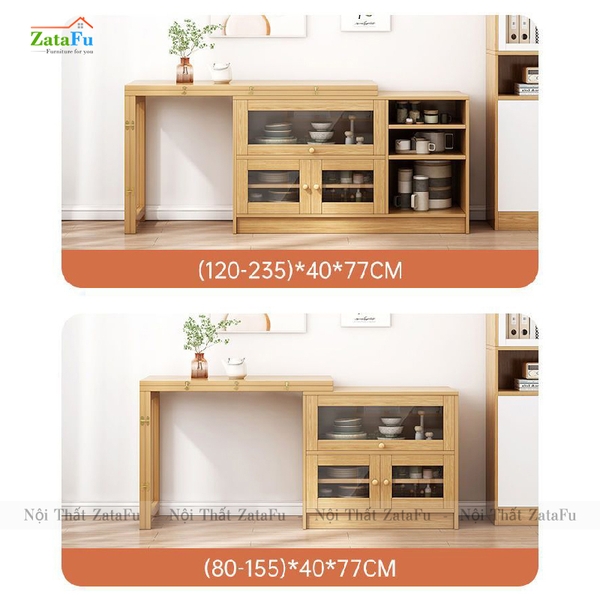 Bàn ăn gấp gọn kết hợp tủ kệ đựng đồ. |