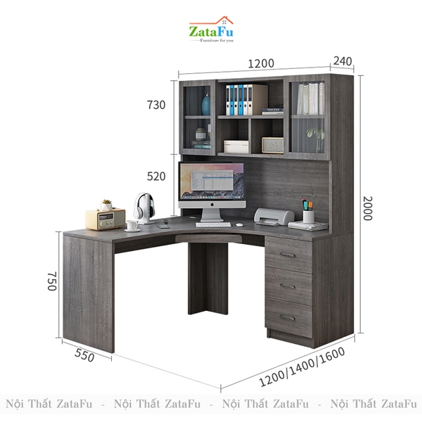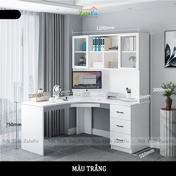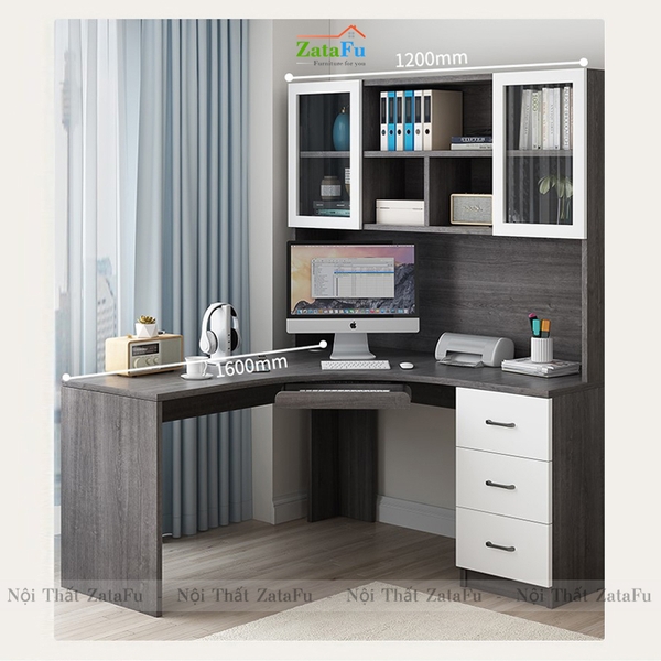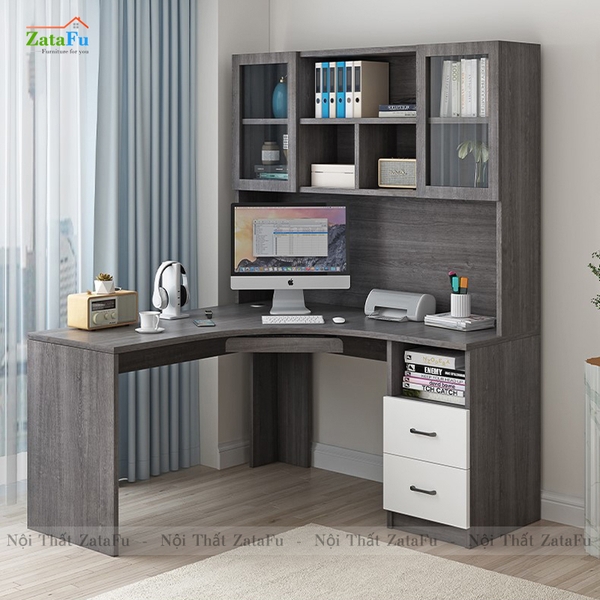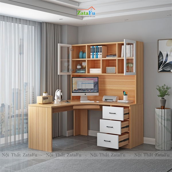 Bàn học bàn làm việc chữu L liền kệ sách lớn. |
