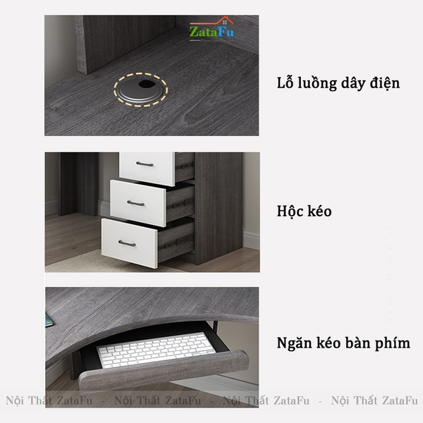 - Bên trên mặt bàn được thiết kế thêm một chiếc lỗ luồng dây điện, để khách hàng có thể luồng các sợi dây điện trong các thiết bị mà không giăng bày sợi nọ sợi kia ra bàn, vừa làm mất thẩm mĩ, vừa chiếm diện tích mà còn rất vướng víu.
