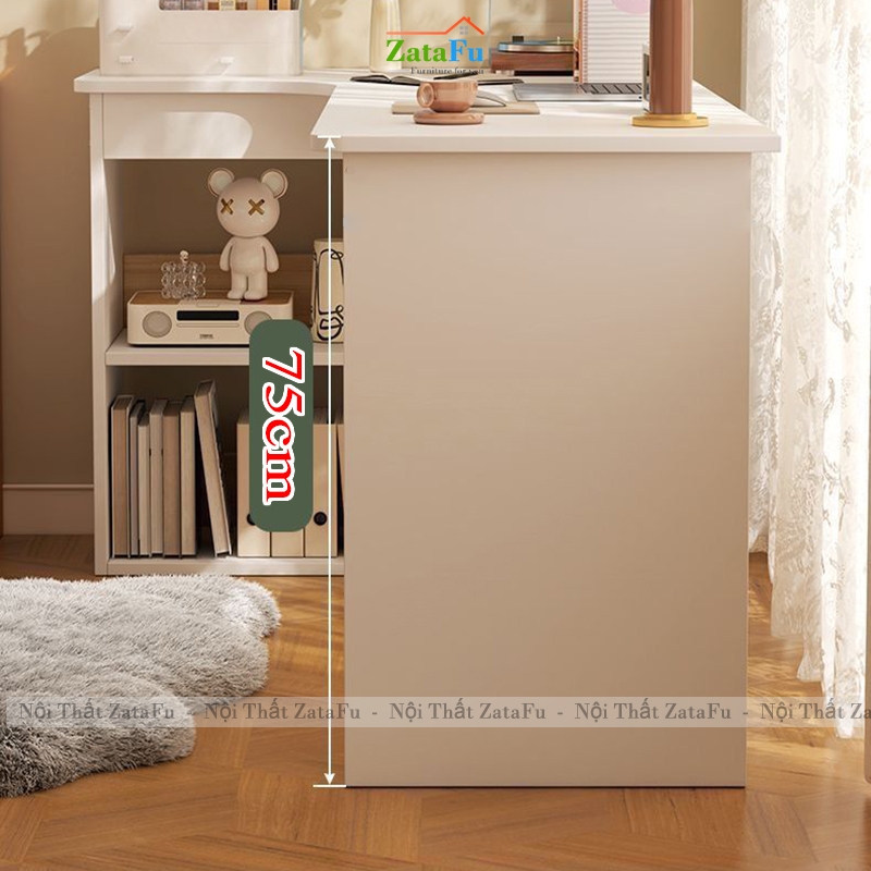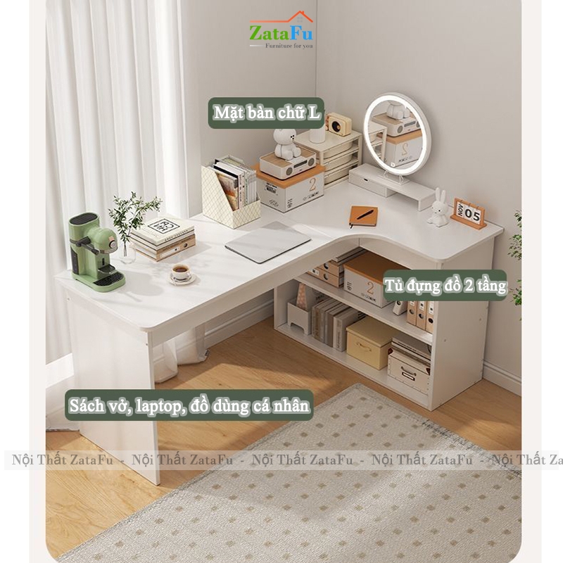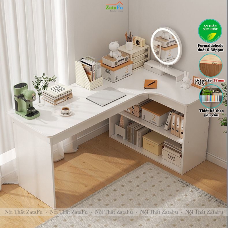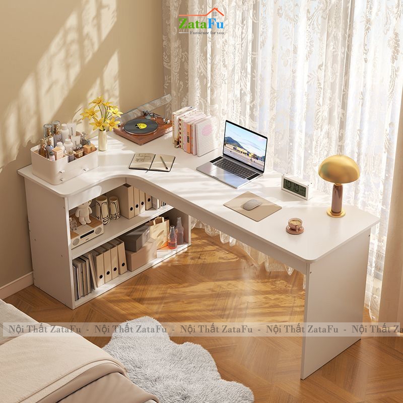 Thiết kế mặt bàn chữ L thông minh giúp tận dụng tối đa góc tường, mở rộng không gian làm việc mà vẫn gọn gàng, phù hợp cho phòng ngủ, phòng làm việc tại nhà hoặc căn hộ chung cư hiện đại.