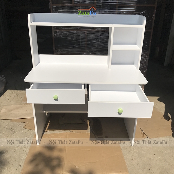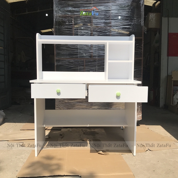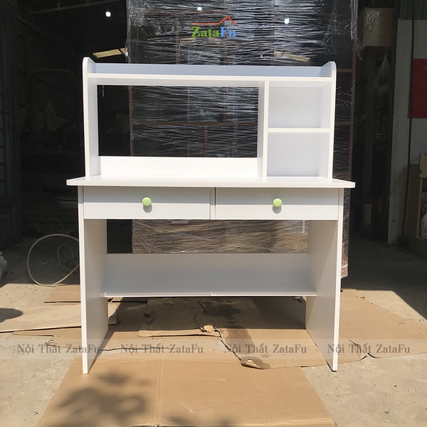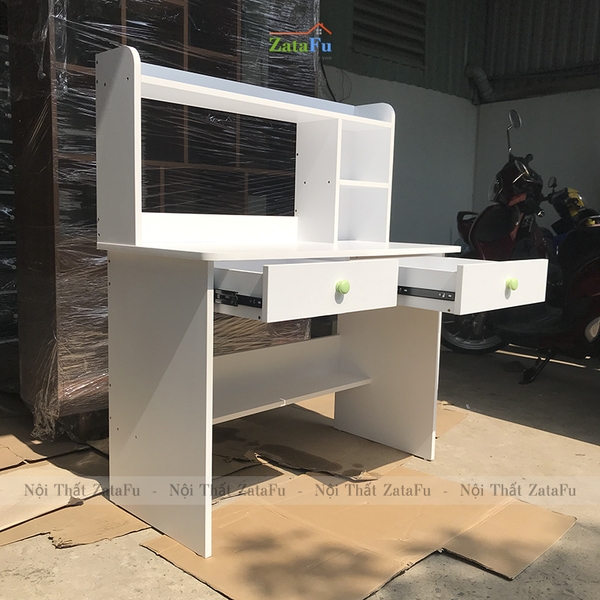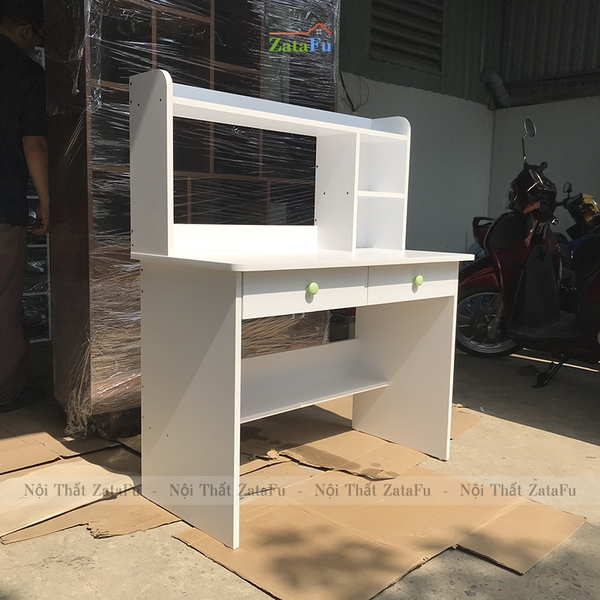 Phía trên mặt bàn tích hợp phần kệ sách nhỏ gồm 2 ngăn kệ nhỏ và phần đầu kệ sách, phần bên cạnh được thiết kế trống mặt lưng để làm vị trí đặt máy tính, laptop. Với kích thước nhỏ, kệ chỉ chứa được số lượng sách vở, tài liệu, dụng cụ học tập trong phạm vi cho phép. Khu vực đầu kệ là vị trí phù hợp để trưng bày các món đồ dùng cá nhân, đồ lưu niệm trang trí,... Tận dụng hình dáng từng món đồ đặt lên đó để biến tấu cho khu vực bàn làm việc của mình thêm sinh động luôn là ý tưởng được nhiều khách hàng áp dụng.