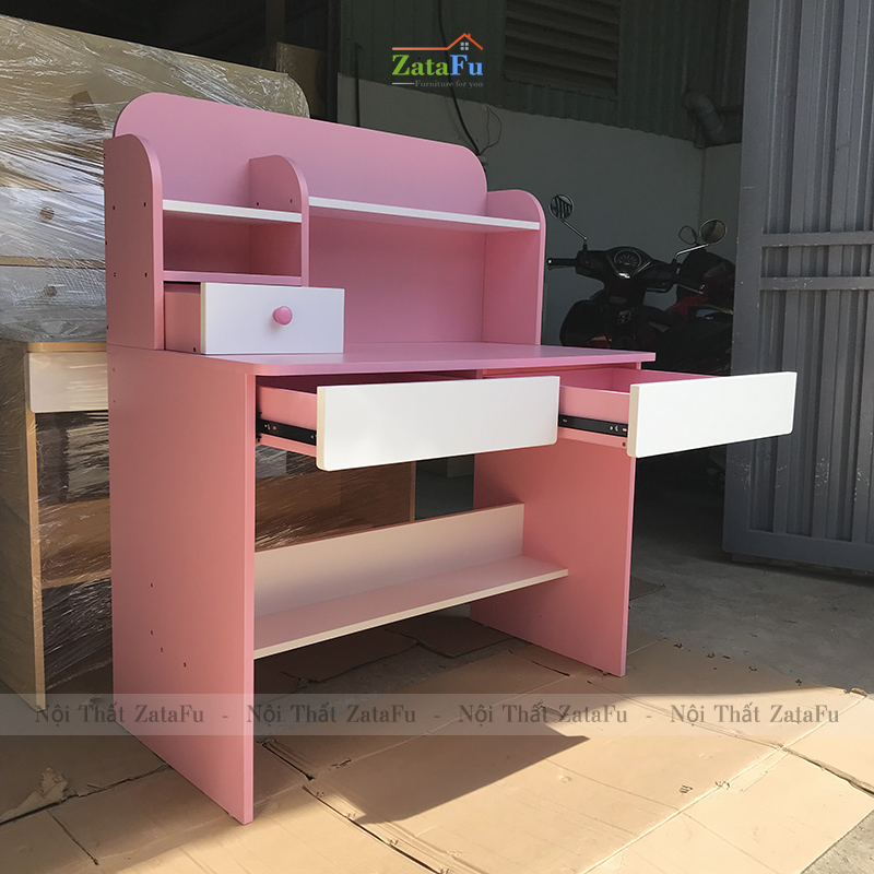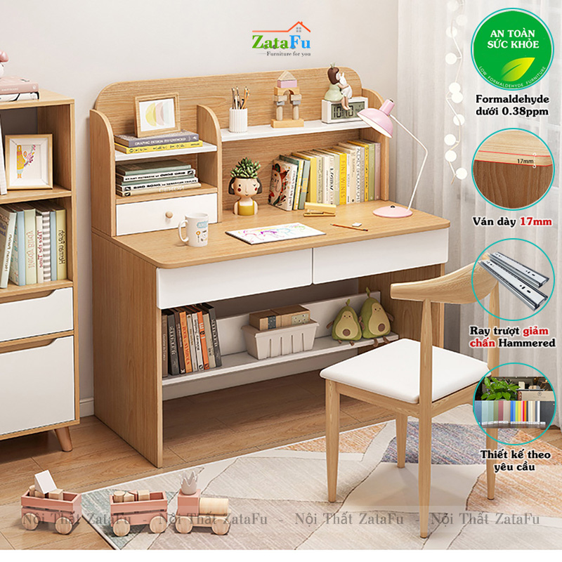 - Bàn học được chế tác từ gỗ công nghiệp MDF - chất liệu thường được sử dụng để sản xuất bàn học, tủ quần áo,... trong nội thất, dày 17mm và được phủ malamine dày 2 mặt, bảo vệ và đảm bảo độ chắc chắn cho bàn.