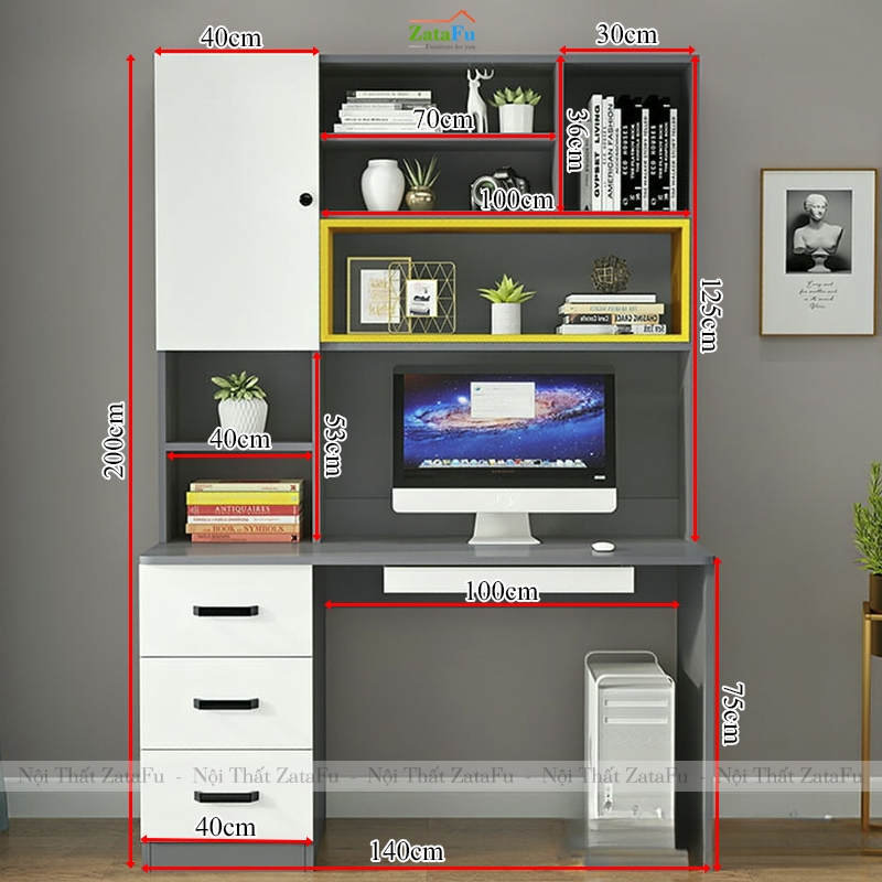 - Với kiểu dáng đơn giản là chỉ có bàn học, bàn làm việc đi liền kệ sách bên trên, khách hàng có thể đặt sản phẩm ở nhiều vị trí thích hợp trong nhà, và đặc biệt là sản phẩm này có thể sử dụng cho nhiều độ tuổi, ngay cả con trẻ cũng có thể ngồi học trên