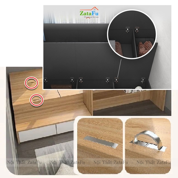 Cửa mở hộc được cố định bằng bản lề inox giảm chấn và sử dụng tay nắm âm lật xoay 180 độ là giải pháp thiết kế hiện đại, tiện lợi cho các loại hộc tủ. Với sự êm ái, nhẹ nhàng không gây tiếng động cùng sự tiện lợi khi đóng mở hộc, không chỉ riêng giường ngủ mà ngay cả phụ kiện đi kèm cũng đảm bảo mang lại cho ta trải nghiệm tuyệt vời.