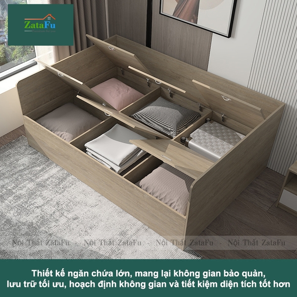 Thiết kế giường ngủ cũng rất quan trọng để mang lại sự thoải mái cho người sử dụng, vì thế các ngăn lưu trữ thông minh được tích hợp trực tiếp bên dưới mặt phản giường sẽ tạo ra căn phòng ngủ sạch sẽ, thoáng mát cùng không gian lưu trữ hiện đại, độc đáo. Ngăn chứa đồ này có thể sử dụng để lưu trữ quần áo, giày dép, chăn ga gối và các vật dụng khác thay tủ quần áo, phù hợp nhu cầu lưu trữ của từng gia đình.