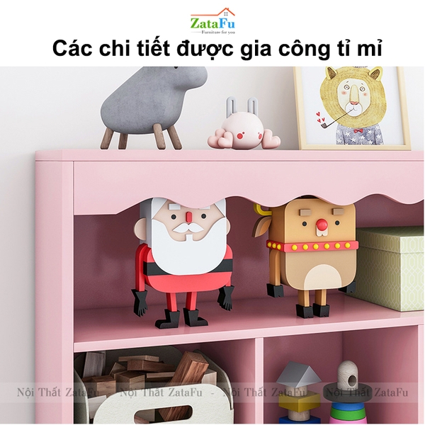 - Từng chi tiết được gia công tỉ mỉ, ví dụ như các góc nhọn được xử lí cẩn thận để tránh tổn thương con trẻ, thiết kế thanh lượn sóng tăng thêm sự đáng yêu, phần đáy được làm cao để cố định khung tủ chắc chắn, pad chống lật được khóa chặt sau tấm lưng... Tất cả chi tiết đều tập trung bảo trợ cho một chiếc kệ sách trang trí chất lượng, an toàn.