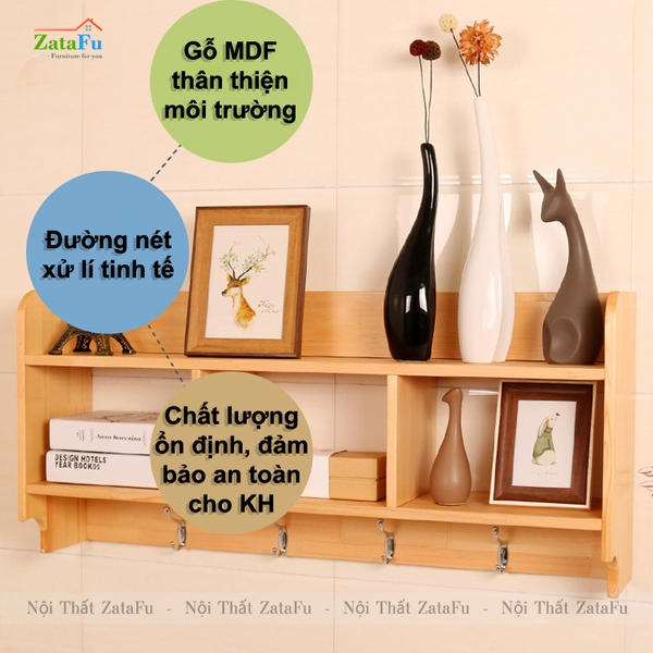 - Kệ trang trí treo ở cửa ra vào: Vị trí phía trên dùng các món lưu niệm trưng bày để làm khu vực này bớt nhàm chán, vị trí móc treo là nơi để treo mũ món, chìa khóa, áo khoác,... và các món vật dụng khác luôn cần sử dụng mỗi khi ra đường. Việc tập trung đồ vật vào 1 chỗ sẽ giúp tiết kiệm thời gian tìm kiếm, tránh thất lạc và cũng đảm bảo sự gọn gàng, ngăn nắp cho không gian.