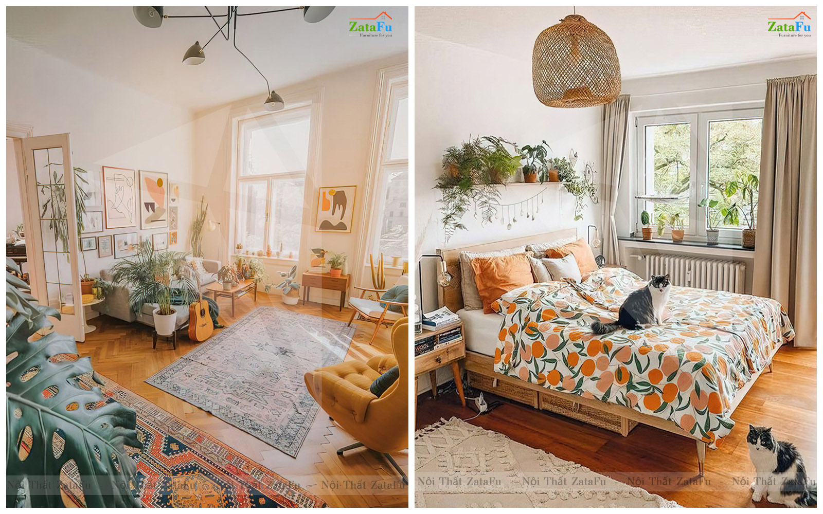 Mặc dù Boho sử dụng rất nhiều đồ nội thất cùng màu sắc sặc sỡ, nhưng phong cách này khá phù hợp với những căn phòng nhỏ, và hầu như được lựa chọn trang trí bởi phần đông giới trẻ, vì thế ta sẽ dễ dàng thấy một căn phòng nhỏ vừa làm phòng khách, vừa làm phòng ngủ, vẫn đầy đủ tiện nghi và không làm mất đi không gian vốn có của nó.