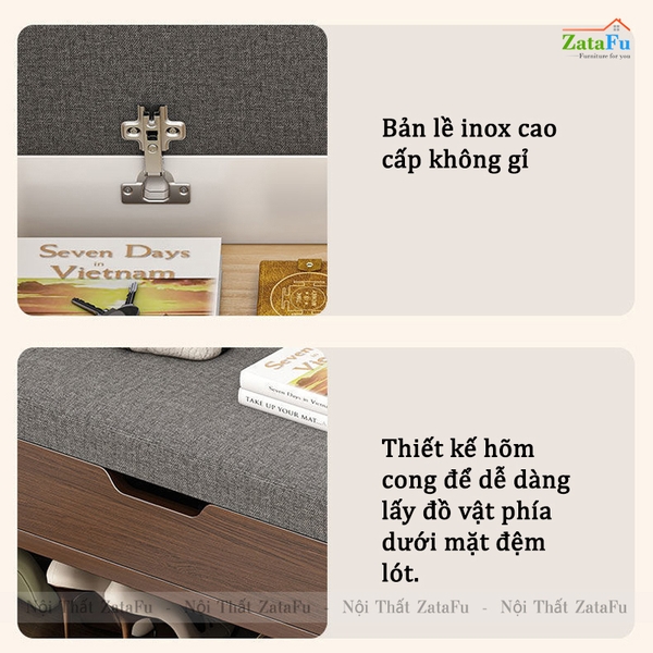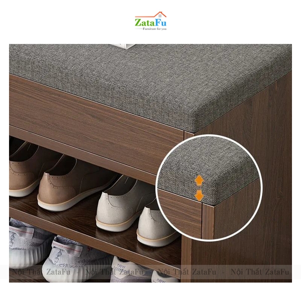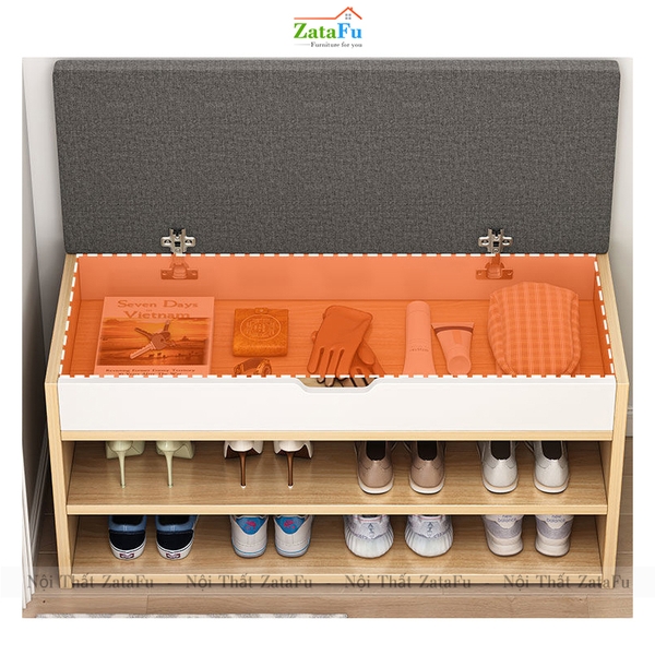 Tủ giày được thiết kế với hình dáng là một chiếc ghế ngồi, bên trên lót 1 tấm đệm làm từ cao su non để cho quý khách vị trí ngồi êm ái, thoải mái. Bên dưới ghế được thiết kế thành 2 ngăn, với sức chứa tối đa từ 6 tới 10 đôi giày (trừ các đôi giày cao như boots) cho khách hàng một sự thuận tiện, dễ dàng lấy giày dép và mang vào chân. Bạn không phải di chuyển qua lại để lấy giày hay phải ngồi xổm, cúi người để mang giày nữa mà chỉ cần ngồi xuống ghế , đưa tay xuống bên dưới là có thể lấy giày mang được rồi.