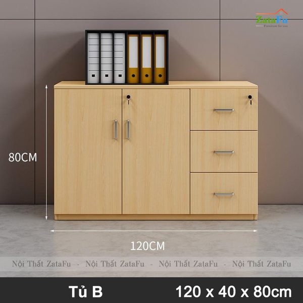 Từ kiểu dáng tủ A kết hợp thêm dãy hộc 3 ngăn kéo bên cạnh là ra thiết kế tủ B. Vẫn mang khả năng lưu trữ tốt, tuy nhiên hộc kéo cũng là yếu tố bổ sung thêm vị trí bảo quản tối ưu cho tủ. Có thể ứng dụng hộc tủ để cất văn phòng phẩm (các loại bút, kẹp bấm, ghim giấy,..) hay các loại giấy tờ mỏng nhẹ.