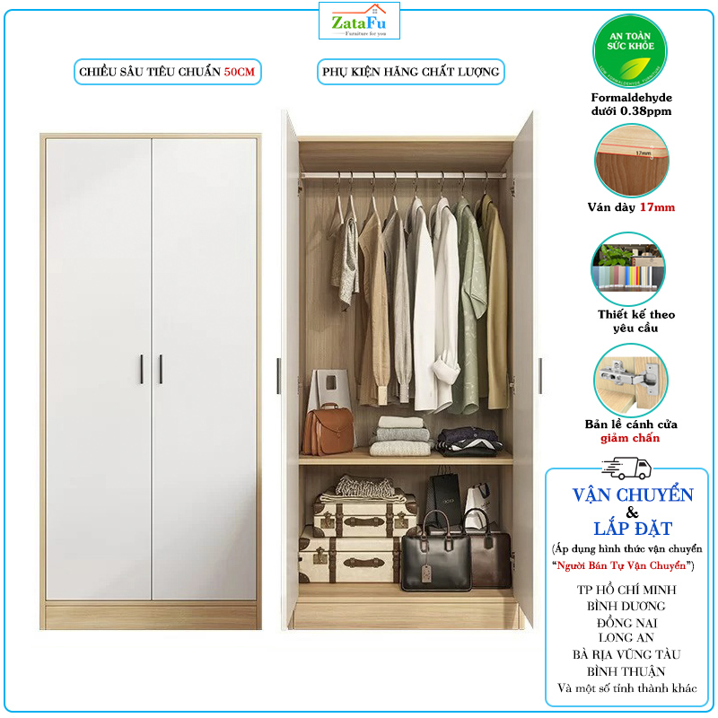 2. Tính chức năng: tủ 2 cánh có chiều ngang 60cm và 80cm, chiều sâu 50cm phù hợp cho hầu hết các loại móc treo đồ. Kích thước không dư thừa, phù hợp cho diện tích nhiều căn phòng. Đồng thời bạn có thể phối nhiều tủ với nhau ghép lại nếu diện tích phòng còn chổ trống và nhu cầu sử dụng cao hơn.